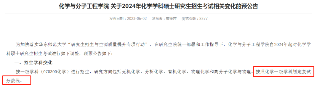 比如华东师范大学化学与分子工程学院发布通知按一级学科(070300化学)进行招生,研究方向包括无机化学、分析化学、有机化学、物理化学和高分子化学与物理。按照化学一级学科划定复试分数线。