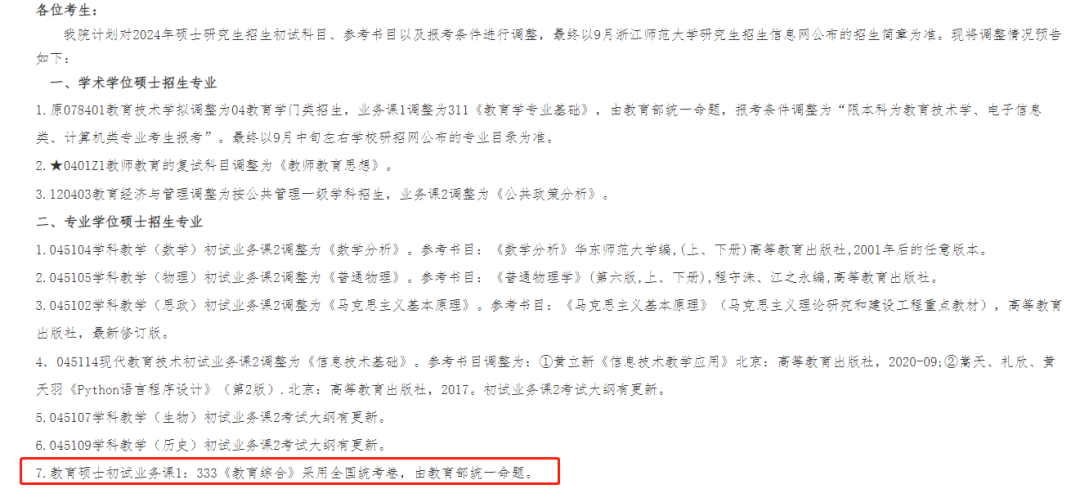 比如浙江师范大学教育学院通知:教育硕士初试业务课1,333《教育综合》采用全国统考卷,由教育部统一命题。